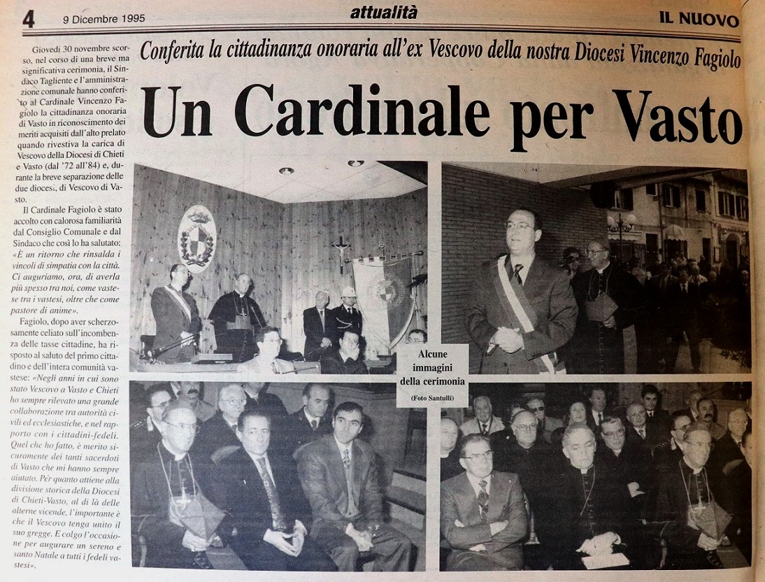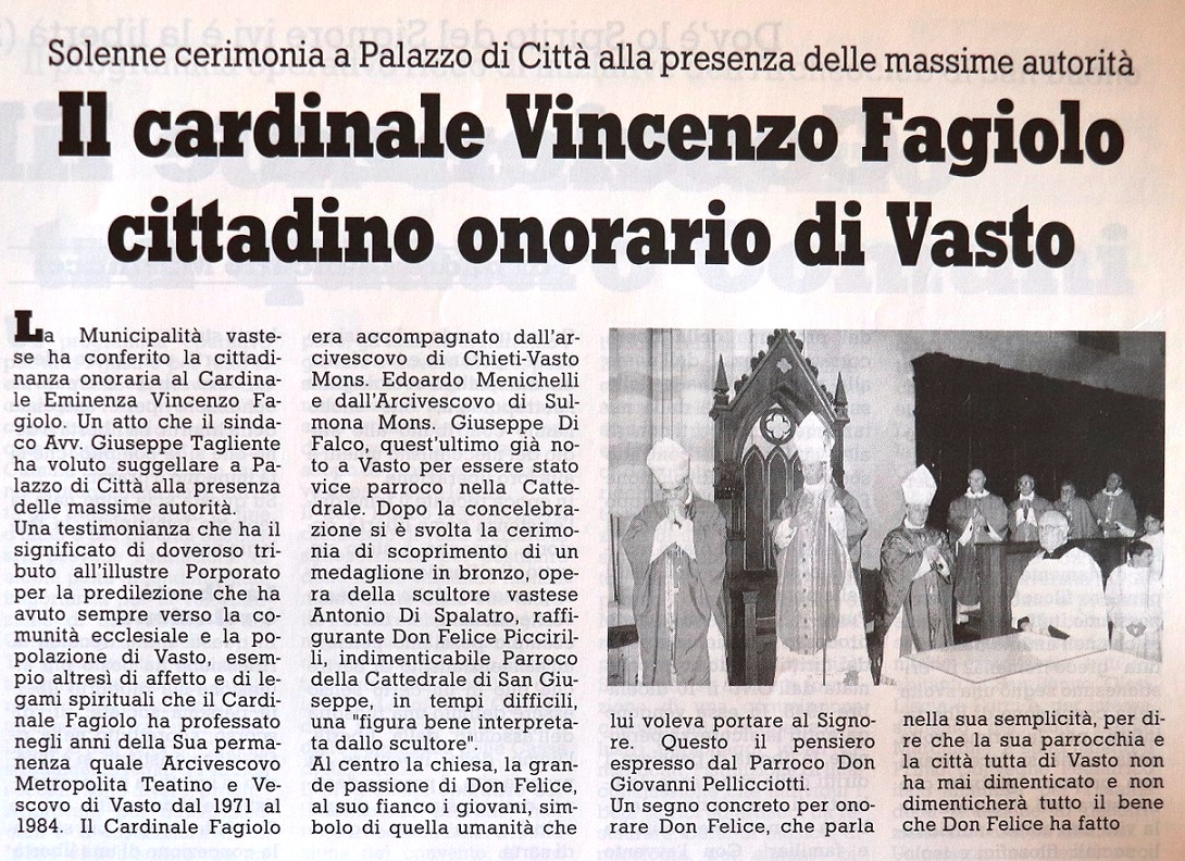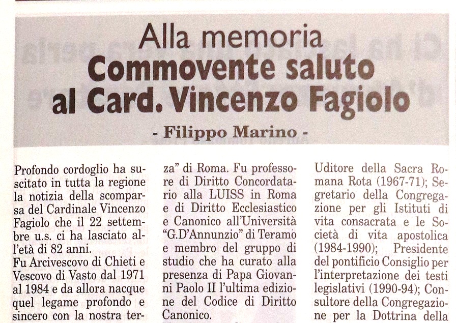 Venti anni fa, il 22 settembre del 2000, ci lasciava Mons. Vincenzo Fagiolo, Arcivescovo Metropolita di Chieti e Amministratore perpetuo di Vasto dal 1971 al 1982, e primo Vescovo della ricostituita Diocesi di Vasto dal 24 agosto 1982 al 15 luglio 1984. Poi nominato cardinale. Una data importante, sicuramente da ricordare, per un personaggio molto amato dai vastesi, con una presenza imponente e contraddistinto da una grande signorilità.